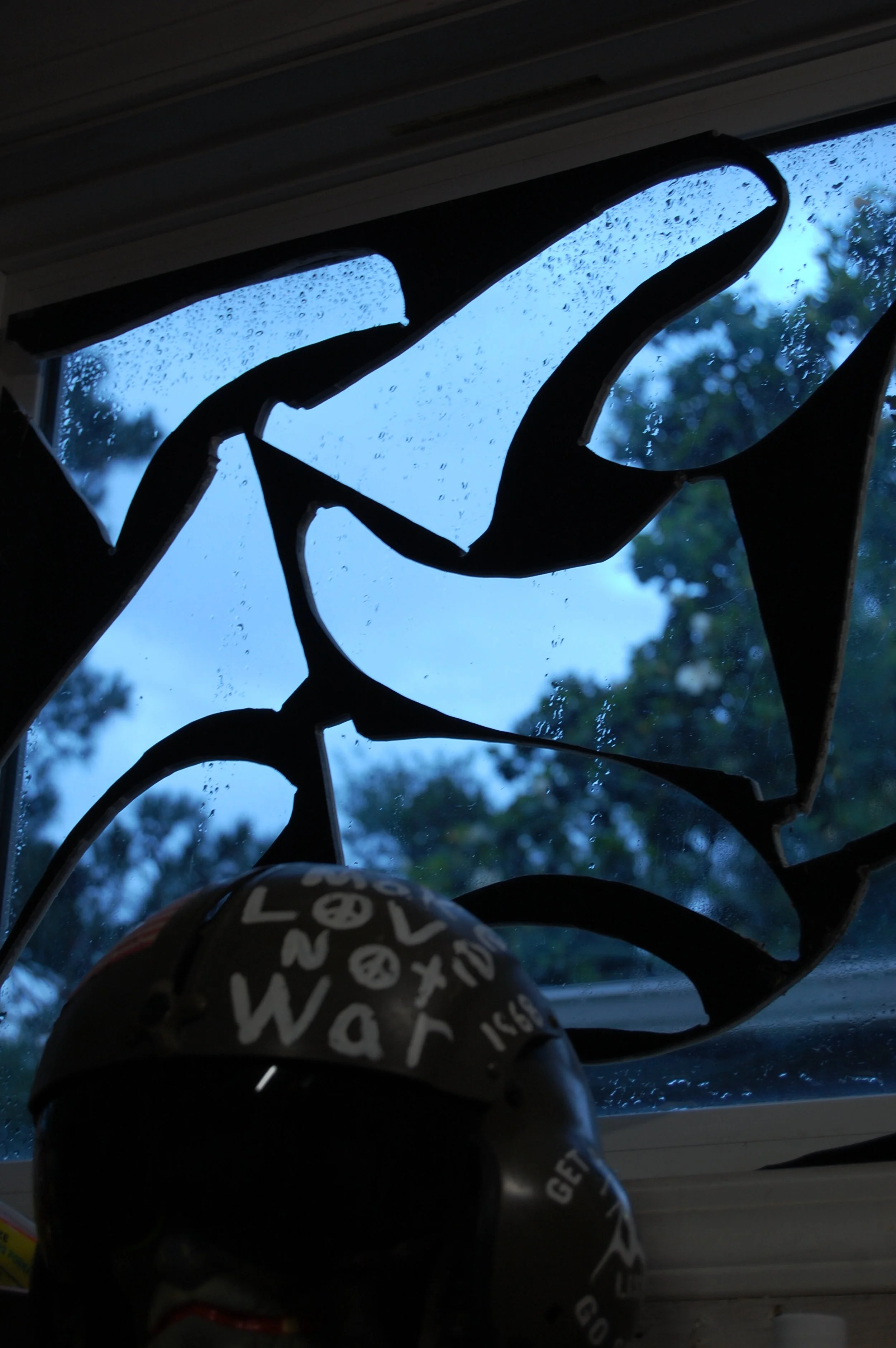 Vintage pilot helmet with “Make love not war” painted on it below cutouts of fin shapes in Leo’s garage.
